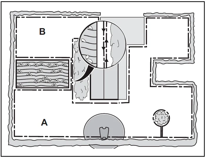 The boundary wire must be laid out in a loop around the entire work area (A+B). Please note that the recommended maximum length of the boundary wire is 800 metres/2600 feet (for Aspire R4: 300 metres/980 feet).